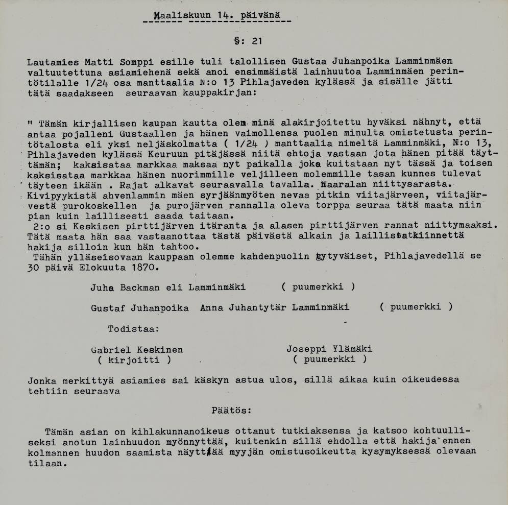 pojalleen Matille ja tämän puolisolle Eveliina Erkintyttärelle 16.10.1878. He puolestaan sitoutuivat kaupan